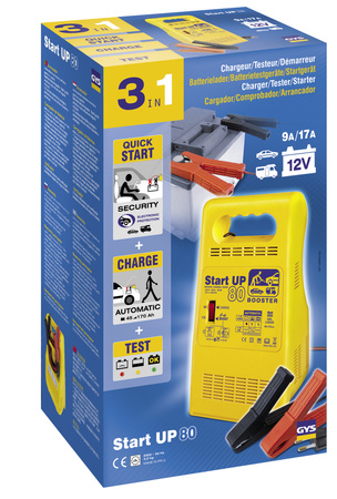 - GYS Start’Up 80 to prostownik 3w1 z rozruchem i testerem 12 V. Umożliwia szybkie uruchamianie pojazdów, automatyczne ładowanie akumulatorów 45–170 Ah, oraz bezpieczną pracę bez odłączania baterii.