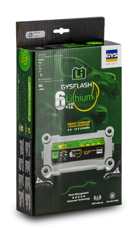 GYSFLASH 6.12 Lithium to zaawansowana, automatyczna ładowarka 12 V przeznaczona do akumulatorów litowo-żelazowo-fosforanowych (LiFePO4) stosowanych w samochodach i motocyklach. Wyposażona w 8-stopniową inteligentną krzywą ładowania z technologią EBS, zapewnia szybkie, bezpieczne i w pełni zbalansowane ładowanie ogniw.