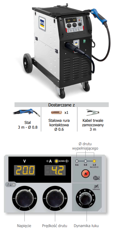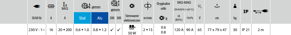 - Prosta konfiguracja (3 ustawienia) upraszczająca użytkowanie: wybór średnicy drutu, natężenia i prędkości podawania drutu.